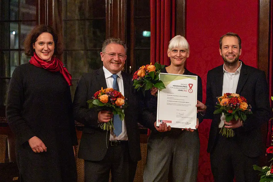 Die Senatorin für Umwelt, Klima und Wissenschaft, Kathrin Moosdorf (l.), verlieh den Bremer Hochschulpreis an drei Lehrende der Bremer Hochschule (von links). Jeremy Hookway, Dr. Anja Kamp und Prof. Dr. Stefan Veltel. Foto: Wissenschaftsressort