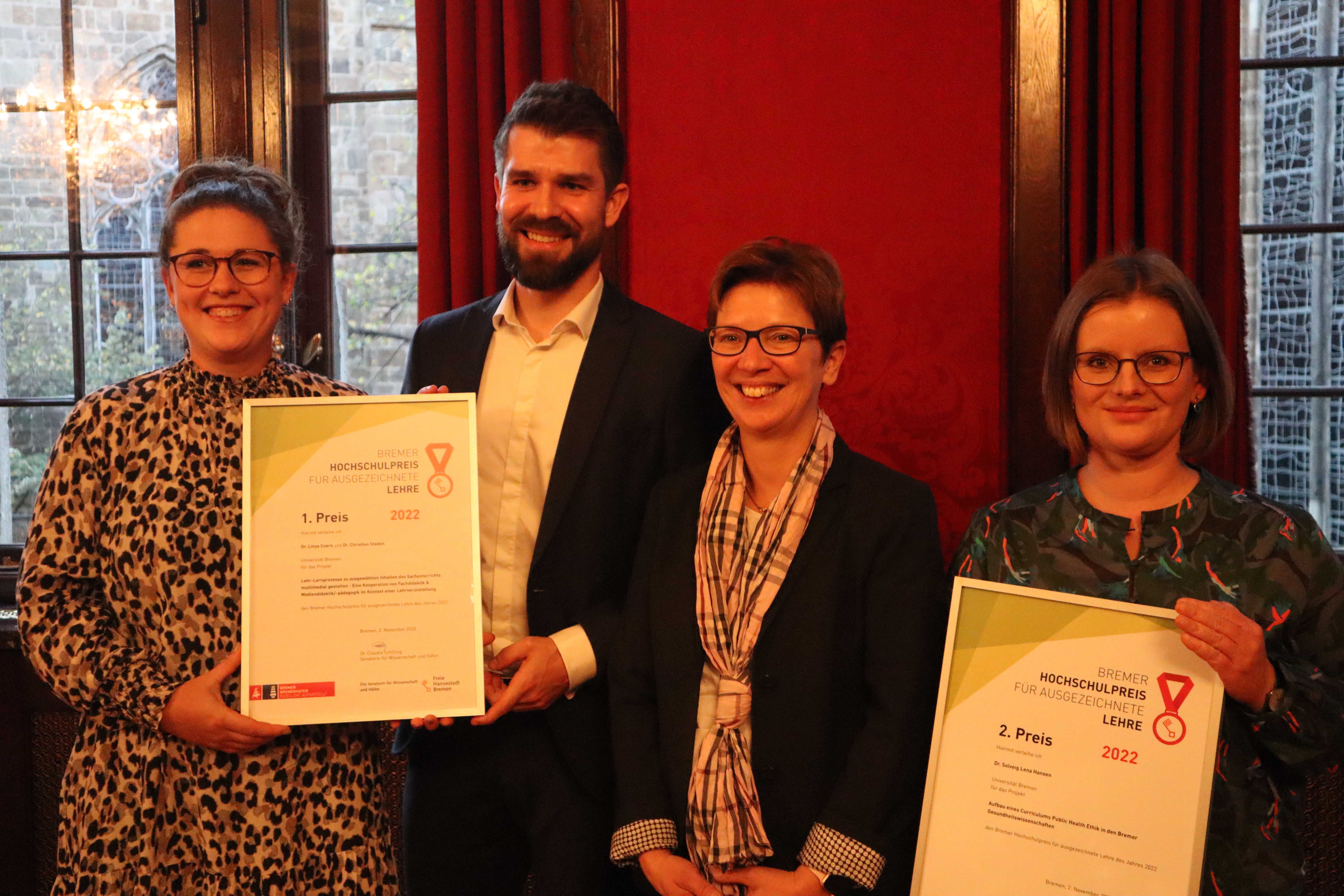 Freuen sich über den Preis für ausgezeichnete Lehre (v.l.): Dr. Linya Coers, Dr. Christian Staden, Wissenschaftssenatorin Dr. Claudia Schilling, Dr. Solveig Lena Hansen.