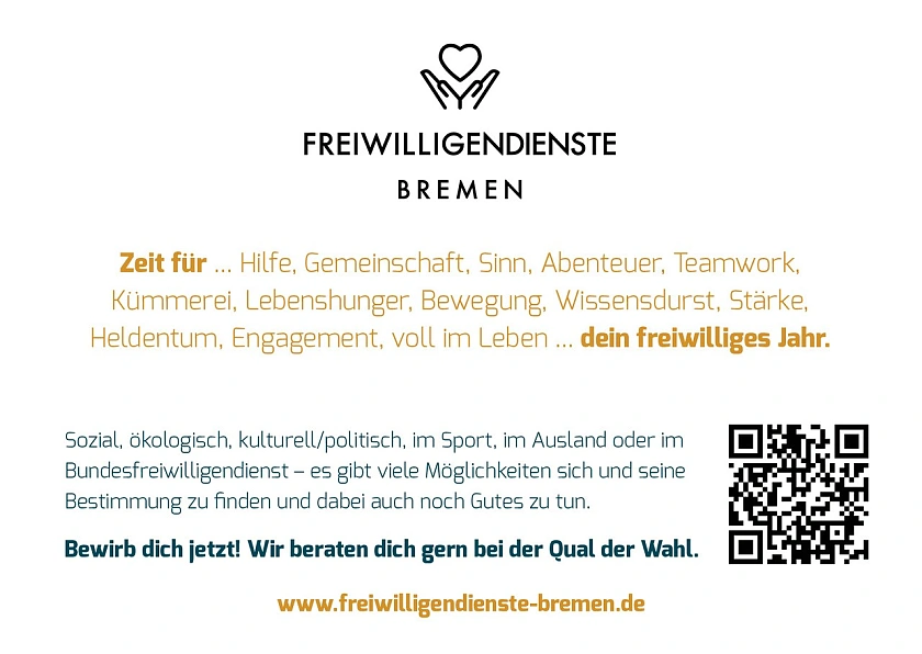 Das Land Bremen bietet mit 57 Plätzen jungen Menschen ein breites und interessantes Tätigkeitsspektrum und verbindet so freiwilliges Engagement mit der Möglichkeit zur Orientierung für die bevorstehende Berufs- oder Studienwahl.