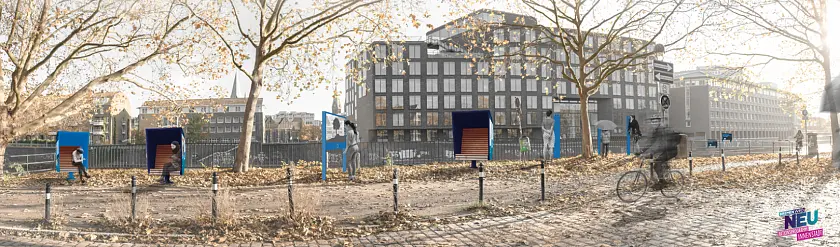 Der Info- und Meetingpoint an der Kleinen Weser auf Höhe der ehemaligen Brautbrücke soll zum Verweilen einladen. Neben den Sitzmöglichkeiten kann hier ein kostenfreies Informationsangebot im Themenpark "Stadt am Fluss - Leben an der Weser" wahrgenommen werden.