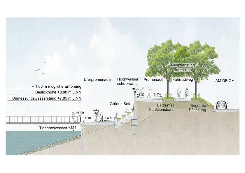 Zusätzlich muss eine spätere Erhöhung um weitere 100 cm berücksichtigt werden. Diese wird noch nicht hergestellt, aber bereits bei der Planung berücksichtigt. Dies zeigt, dass hier nachhaltig geplant wird – falls eine weitere Erhöhung der Hochwasserschutzanlagen notwendig wird, ist dies dann ohne aufwändigen Neubau der Schutzanlage möglich.
