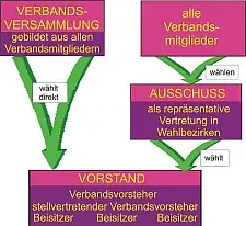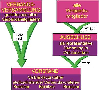 - die Vertretung der Mitglieder (quasi das "Parlament" des Verbandes)In kleineren Verbänden ist dies die Verbandsversammlung, die aus allen Mitgliedern des Verbandes besteht, in größeren Verbänden der Verbandsausschuss, der als repräsentative Vertretung aller Mitglieder von diesen gewählt wird. Die Mitgliedervertretung gibt u. a. den rechtlichen Rahmen für die Arbeit des Verbandes vor (Satzung und Satzungsänderungen, Unternehmen, Plan und Aufgaben, Umgestaltung oder Auflösung), sie wählt den Vorstand